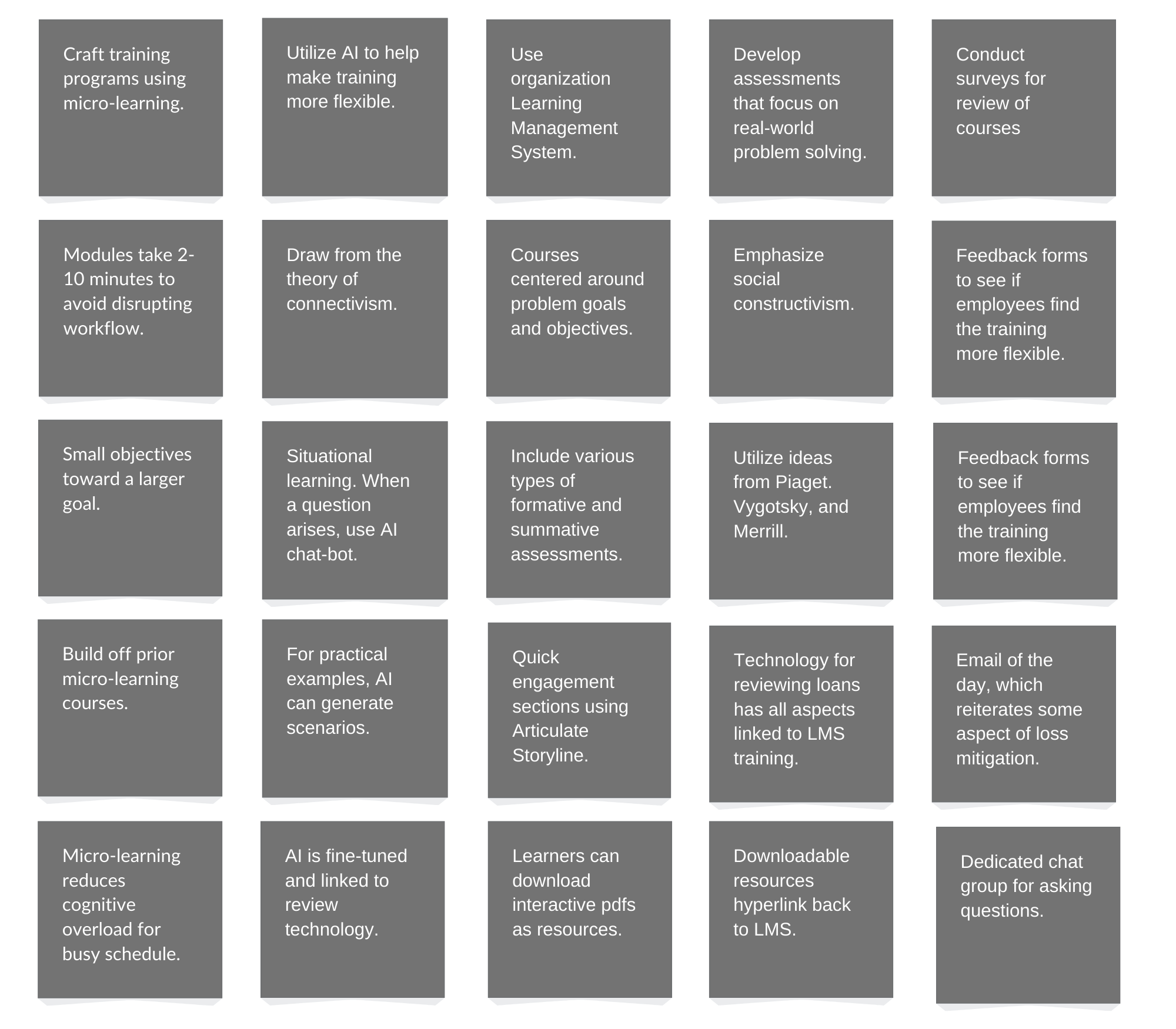 Of several proposed solutions in the report, micro-learning was selected as the most promising. Research on and the benefits of micro-learning are summarized below. Micro-learning, as explained below, focuses on short, bite sized lessons that offer relevant and applicable material.
