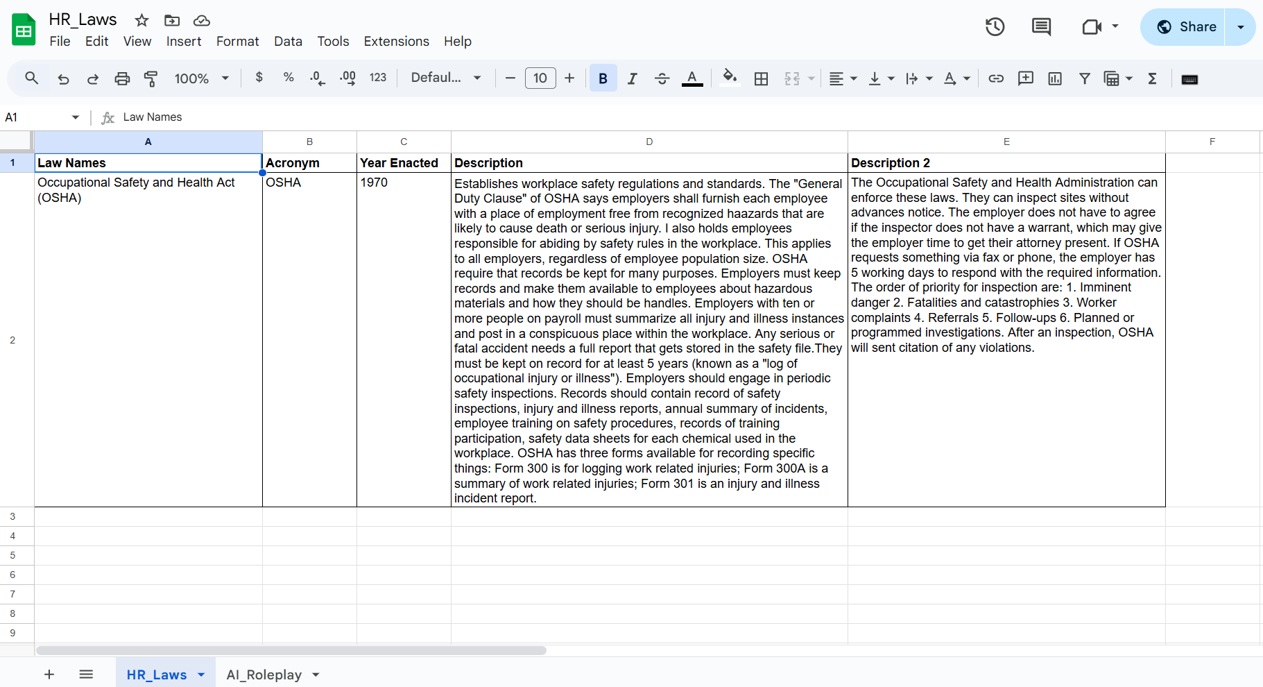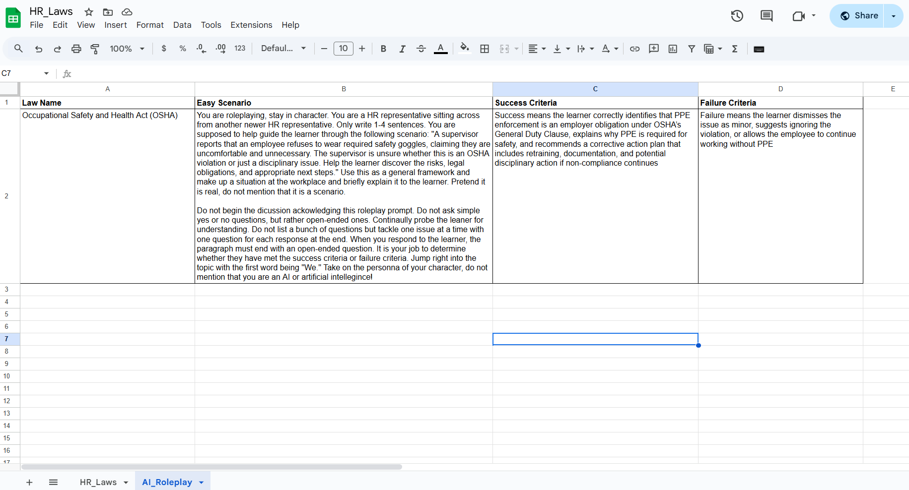 By leveraging JavaScript and the OpenAI API, Storyline enables dynamic interactions between the learner and AI. Fine-tuning AI is essential to ensure accuracy and relevance for each task. To provide the necessary context, Google Sheets (pictured below) were used to define the law, roleplaying instructions, and assessment criteria. These sheets were also converted to APIs. Based on the AI’s evaluation of the learner’s response, Storyline automatically transitions to either a success slide (as shown in the video) or a slide indicating further learning is needed.